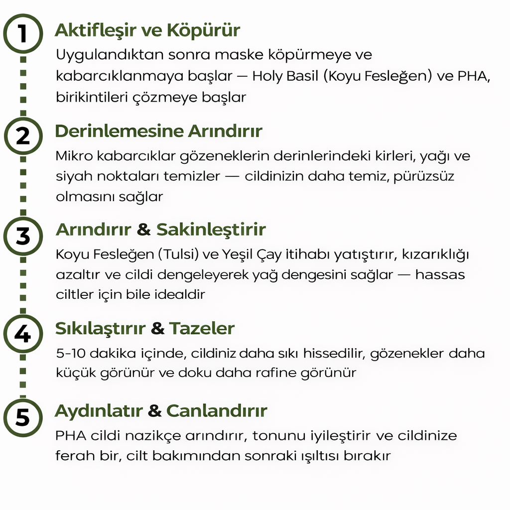 Kullanıcılar, sadece 1-4 hafta içinde, fesleğenin detoks etkisi ve ışıltılı PHA baloncukları sayesinde siyah noktaların azaldığını, gözeneklerin daha sıkı göründüğünü ve cildin daha yumuşak ve temiz hale geldiğini bildiriyor.